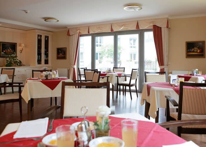 Die Ausstattung der Residenz ist auf die Bedürfnisse älterer Menschen ausgerichtet und bietet hohen Wohnkomfort. Die Bewohner sind in komfortabel ausgestatteten Einzel- oder Doppelzimmern untergebracht, die jeweils über ein eigenes, barrierefreies Bad mit Dusche, Waschbecken und Toilette verfügen. Die Zimmer sind möbliert und bequem per Fahrstuhl zu erreichen, wobei die Möglichkeit besteht, die Räume mit eigenen Möbeln individuell einzurichten. Bodentiefe Fenster sorgen für viel Tageslicht und ermöglichen einen Blick ins Grüne. Für die aktive Teilhabe am Tagesgeschehen stehen den Bewohnern zahlreiche Hilfsmittel zur Verfügung, von modernen Pflegebetten über Rampen und Handläufe bis hin zu bodengleichen Duschen. Besondere Highlights der Einrichtung sind die thematisch gestalteten Pflegebäder, deren detailreiche Wandmalereien die Bewohner zu entspannenden Fantasiereisen an den Ostseestrand oder den Rhein einladen. Die hauseigene Küche sorgt für frische und gesunde Kost, wobei täglich vier Mahlzeiten inklusive warmer und kalter Getränke sowie zwei kleine Zwischenmahlzeiten angeboten werden. Die Freizeitgestaltung wird durch ein vielfältiges Angebot gefördert, das von Gymnastik, Mal-, Musik- und Spielgruppen über Gedächtnistraining und Kochveranstaltungen bis hin zu wöchentlichen Ausflügen mit dem hauseigenen Bus reicht. Zahlreiche Aufenthaltsräume, ein großer Garten und eine sonnige Dachterrasse dienen als Orte der Begegnung und des Wohlbefindens.