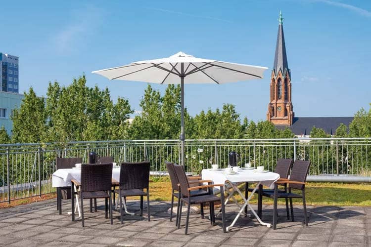Sie erreichen die Pro Seniore Residenz Am Märchenbrunnen im lebendigen Berliner Bezirk Friedrichshain-Kreuzberg, nur wenige Gehminuten vom Alexanderplatz entfernt. Das moderne Neubaugebäude präsentiert sich in hellen, mediterranen Farbtönen und steht eingebettet in die grüne Oase des Volksparks Friedrichshain. Im Erdgeschoss finden Sie einen Supermarkt sowie ein großzügiges Restaurant mit angeschlossener Sonnenterrasse, auf der Sie an warmen Tagen den Blick ins Grüne genießen können. Im Eingangsbereich werden Sie von einer lichtdurchfluteten Rezeption und einem gemütlichen Kaffeestübchen begrüßt; daneben laden eine Bibliothek, ein Veranstaltungsraum und verschiedene Aufenthaltsbereiche zum Verweilen und geselligen Austausch ein.